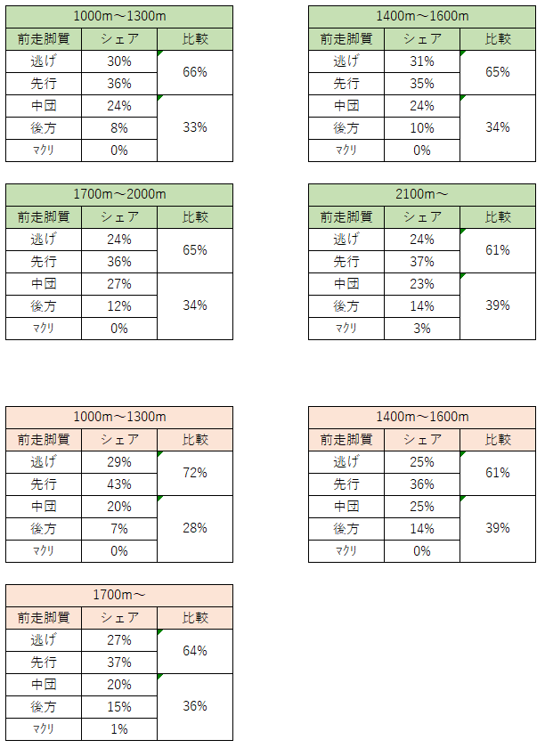 芝の場合、2000メートルまでは割合が変わりませんが、